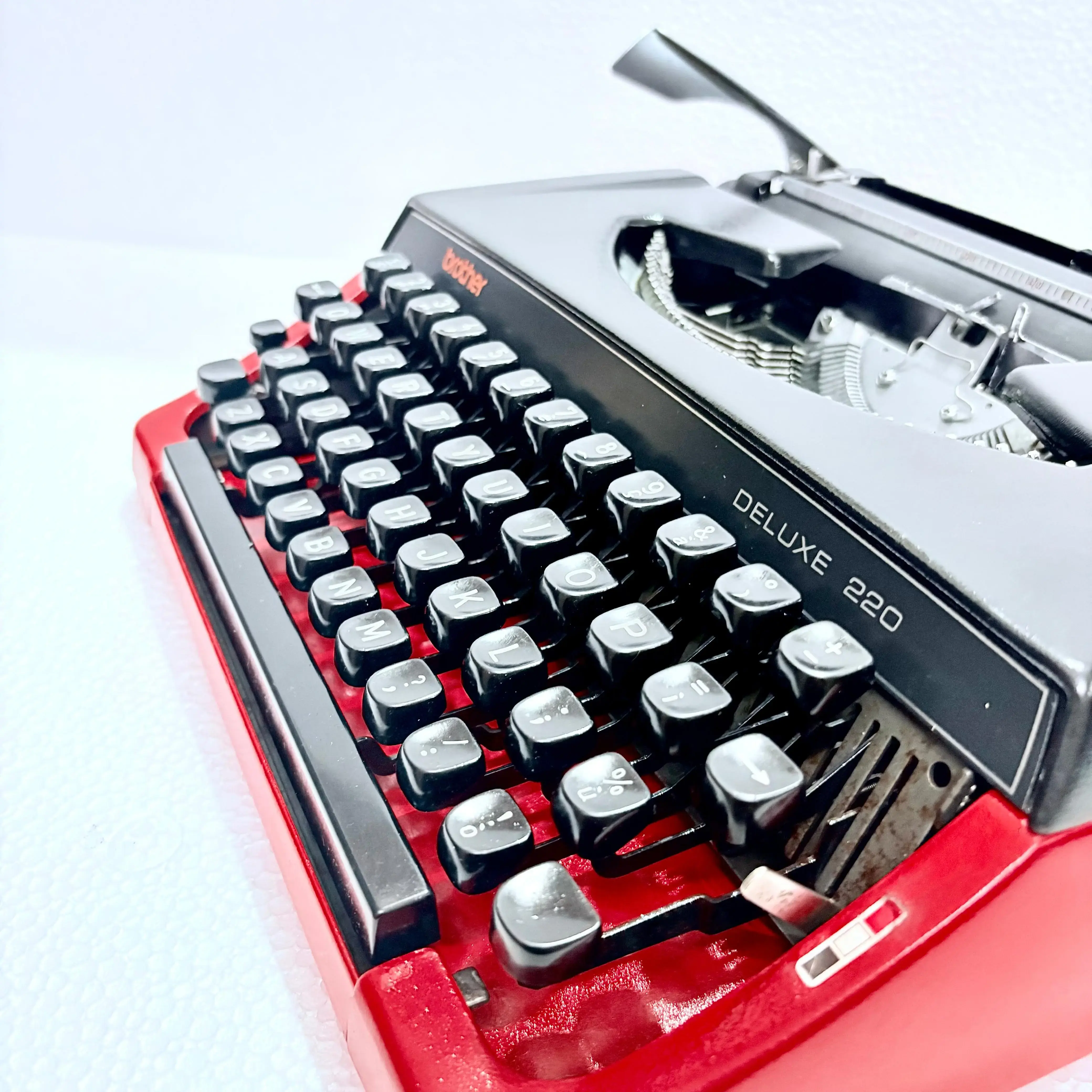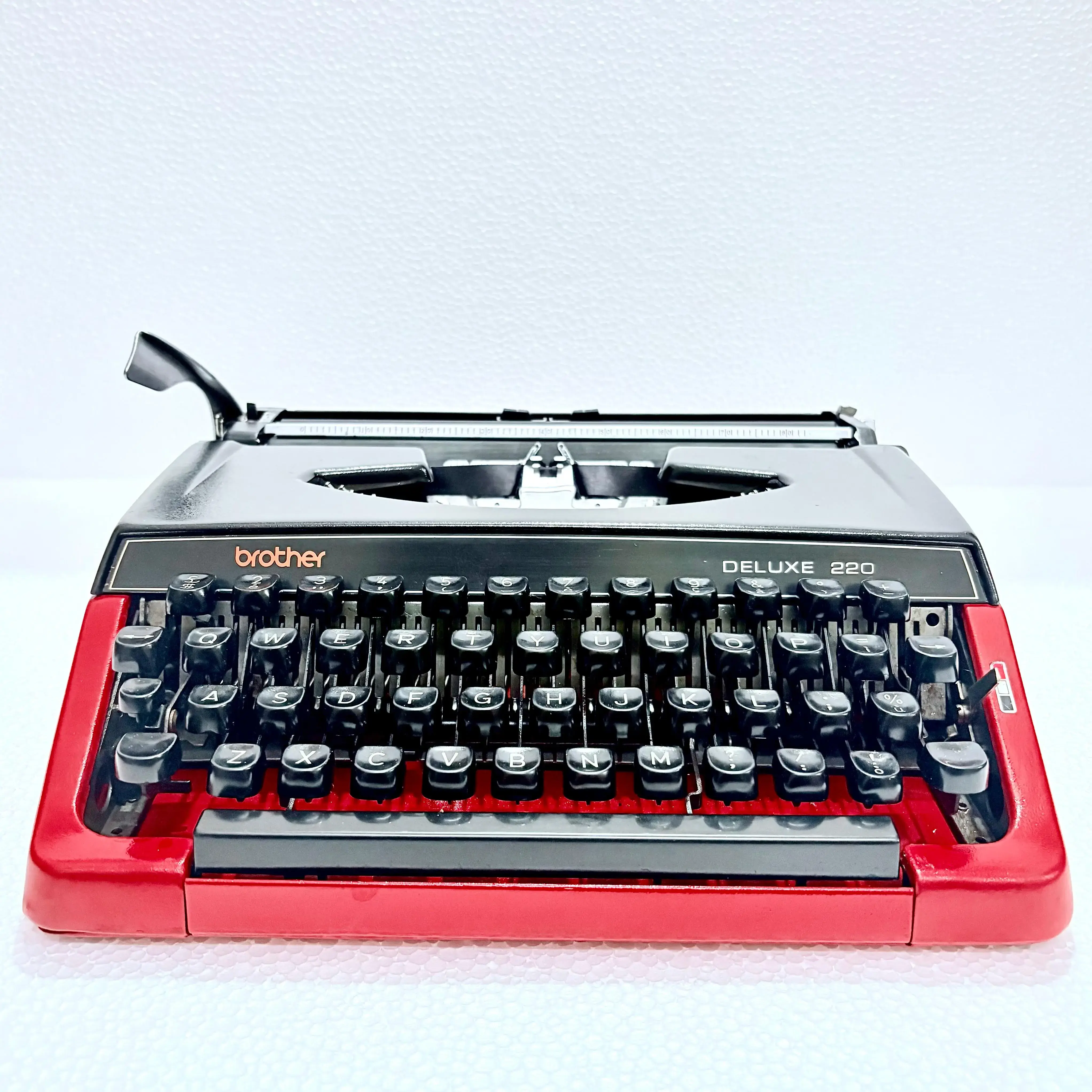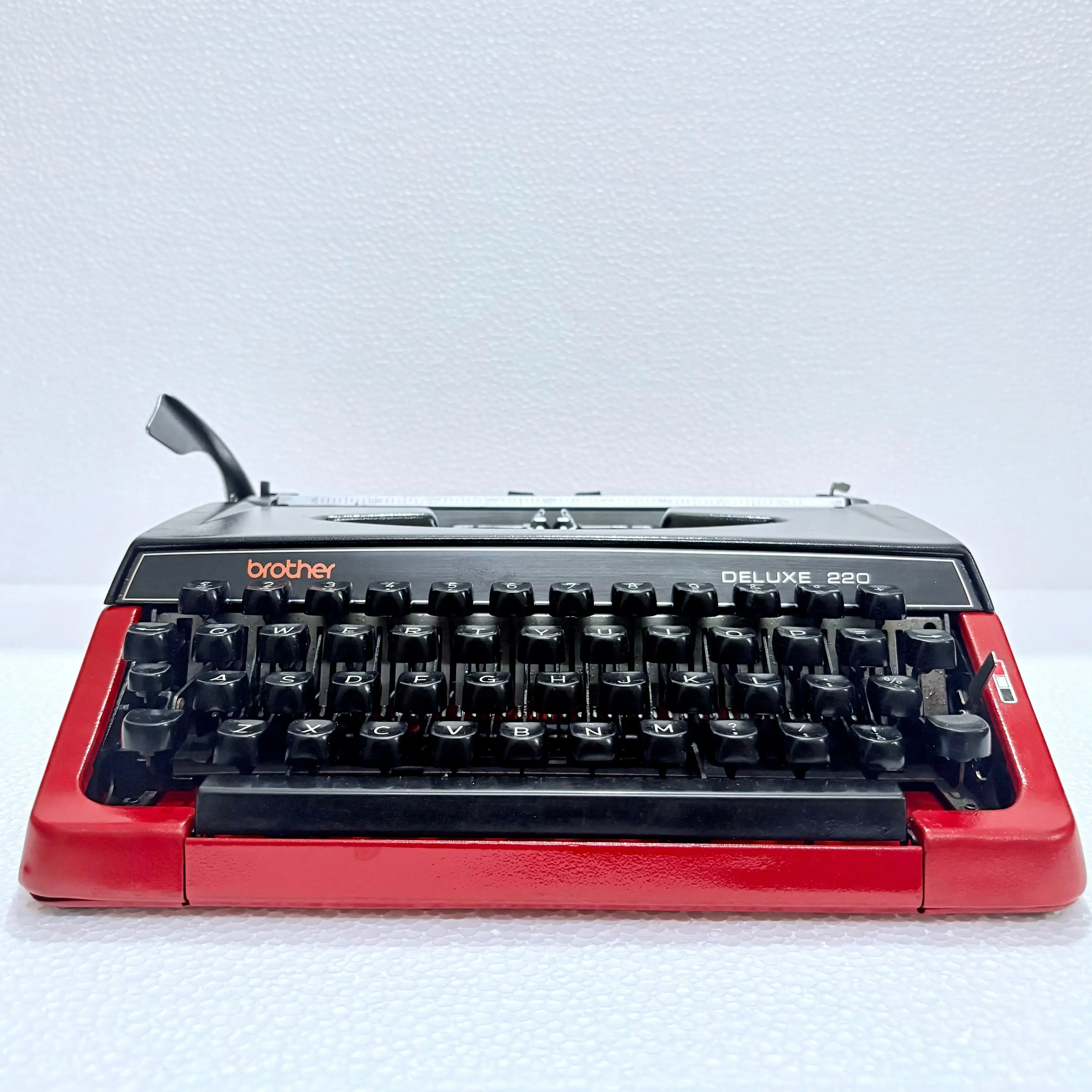 The Brother 220 Deluxe Typewriter comes with its original carrying case, meticulously handcrafted. This bespoke case is designed to fit the typewriter perfectly, ensuring both elegance and protection.