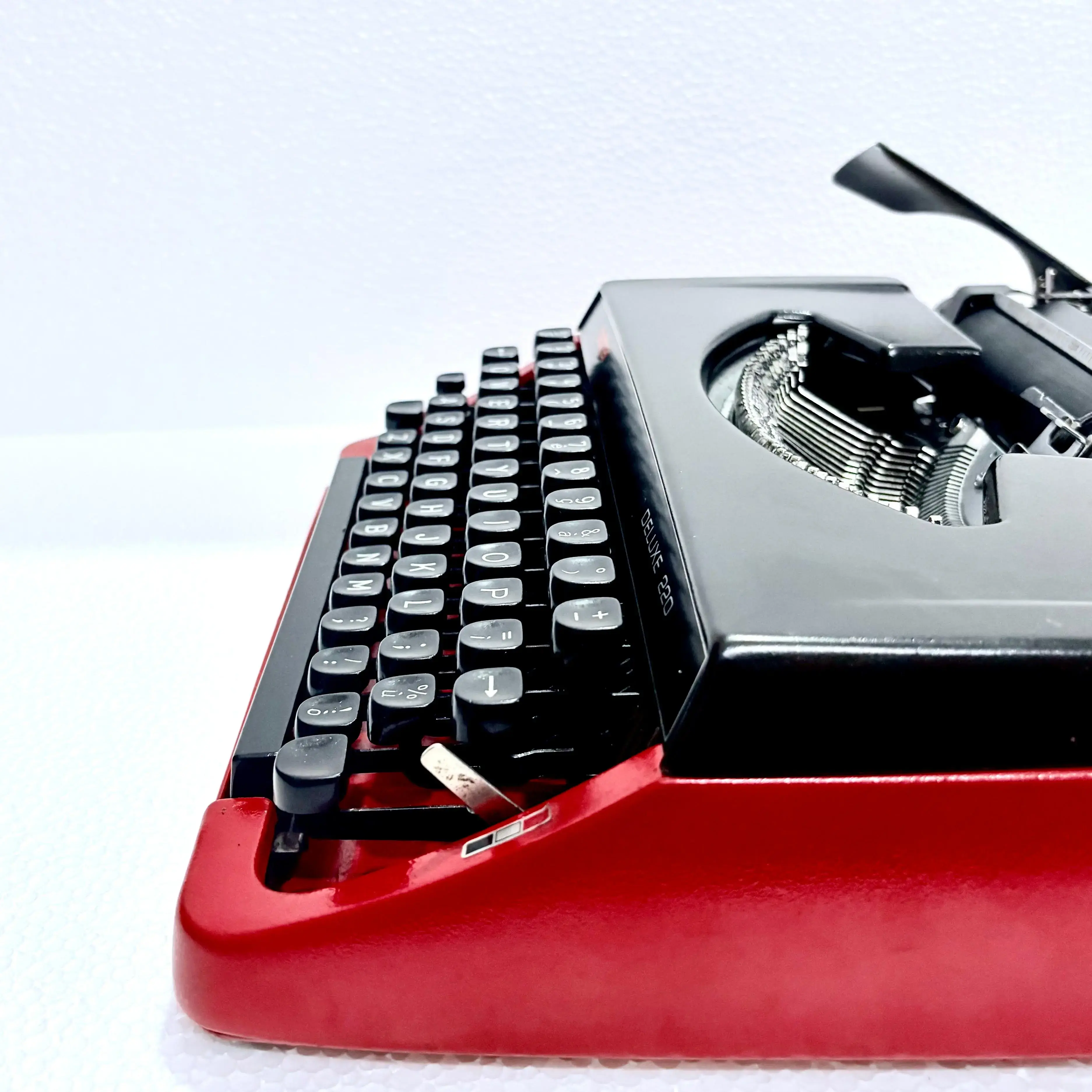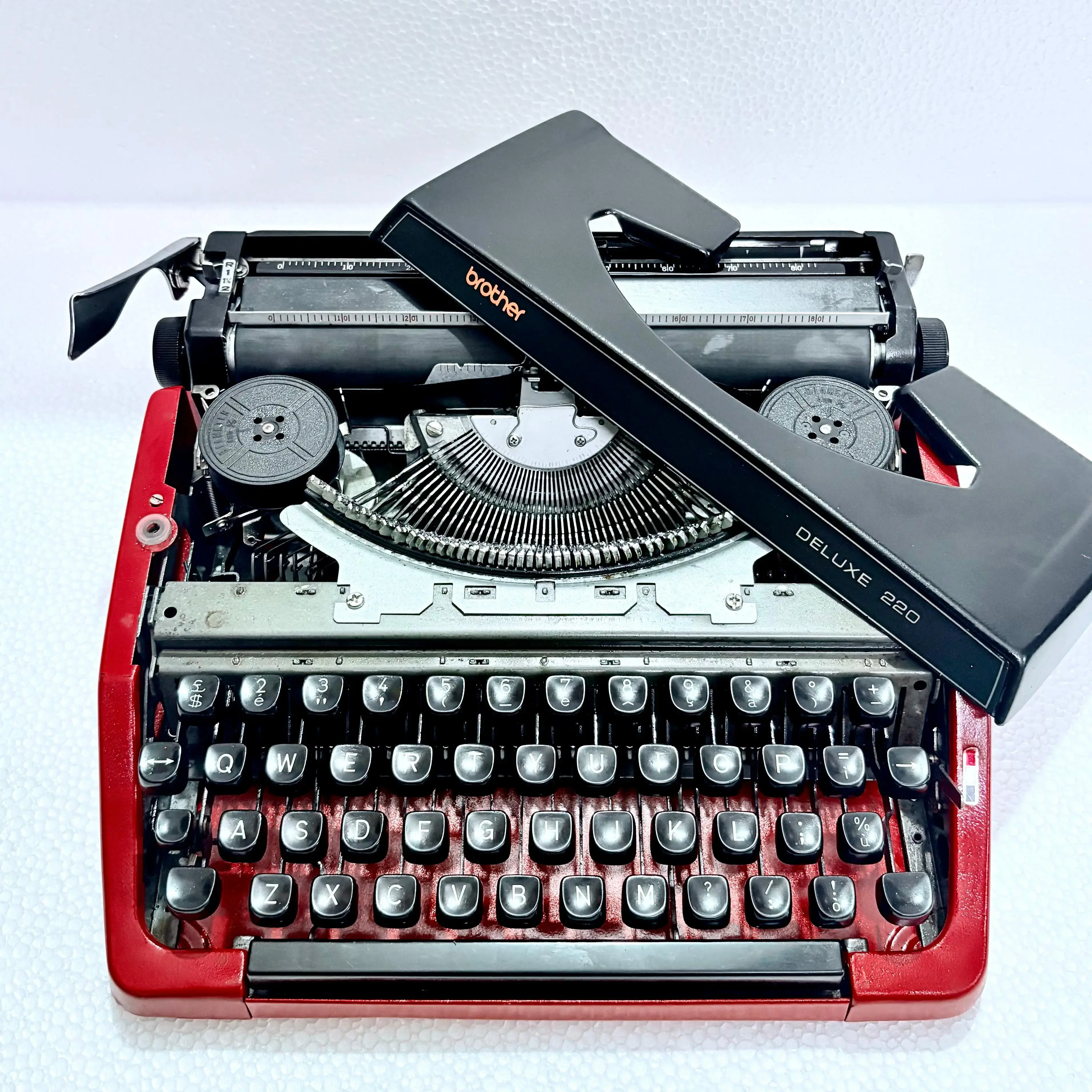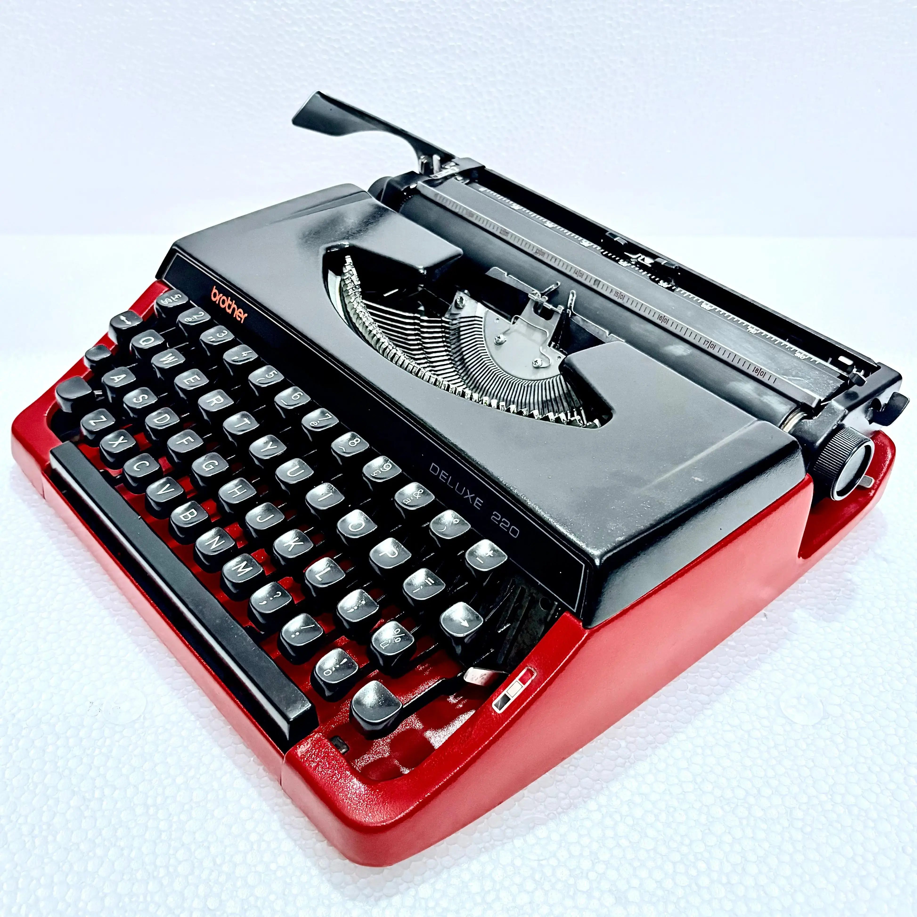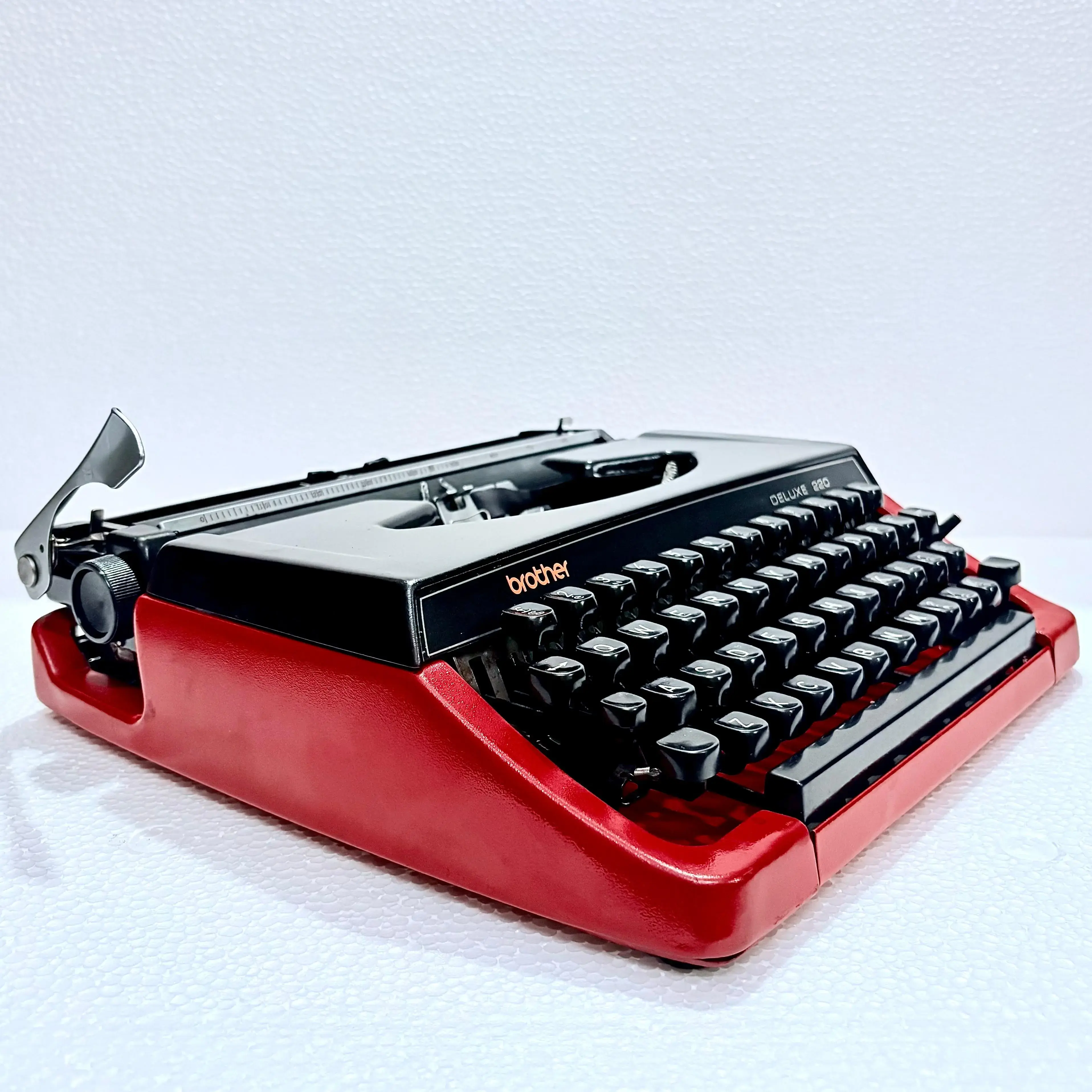 The Brother 220 Deluxe Typewriter comes with its original carrying case, meticulously handcrafted. This bespoke case is designed to fit the typewriter perfectly, ensuring both elegance and protection.